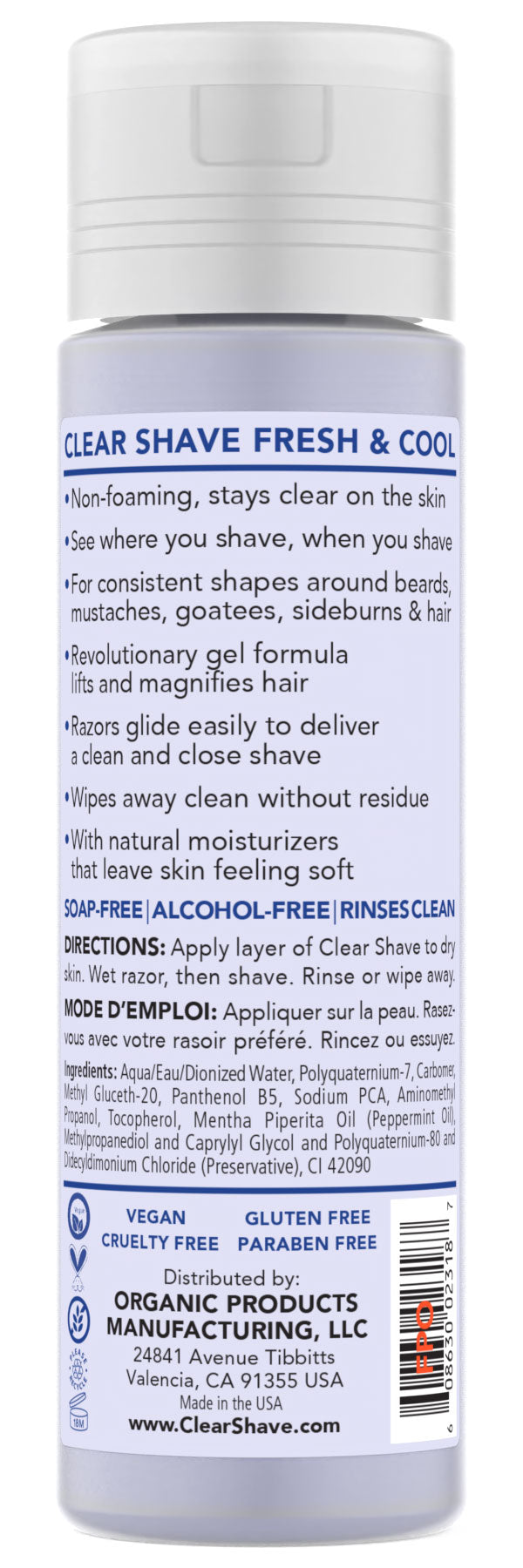 DIRECTIONS: Apply layer of Clear Shave to skin. Wet your razor, then shave. Rinse or wipe away. MODE D’EMPLOI: Appliquer sur la peau. Rasezvous avec votre rasoir préféré. Rincez ou essuyez.